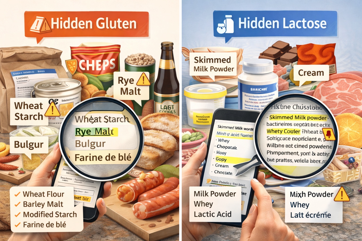 « Sans gluten » et « sans lactose » : deux labels que l’on voit de plus en plus sur les rayons. Mais savoir éviter le gluten ou le lactose dans votre assiette, c’est beaucoup plus complexe qu’il n’y paraît. Ces deux protéines (ou sucres, dans le cas du lactose) se cachent sous des dizaines de noms différents dans les listes d’ingrédients. Et certaines sources sont tellement inattendues qu’elles piègent même les personnes expérimentées.