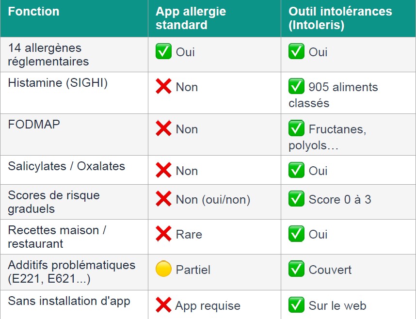 3. Comparatif honnête : apps allergies vs outils intolérances